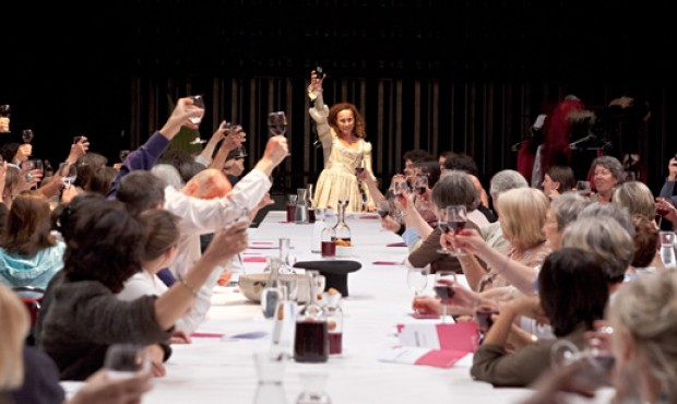 Lorsque l’École d’Art et de Design de Reims organise sous chapiteau «Le Banquet Scientifique» («savoirs et saveurs, pillage et gaspillage»), mes attentes sont fortes : comment la cuisine peut-elle concilier art et sciences? Je déchante très rapidement. Une brochette de chercheurs m’inflige une série de discours aussi hermétiques qu’un plat sous vide. D’un côté, un chef cuisinier (Eric Trochon) chargé d’accommoder (non sans talent) les (nos) restes, de l’autre une installation scénographique de fin d’études aussi pauvre que la communication rose bonbon de Marseille Provence 2013. Comme unique mise en scène circule un caddie qui véhicule cette élite suffisante pendant que nous dégustons des plats négligemment présentés (ici, la forme importe peu…). Parfois, nous sommes invités à nous lever de table pour suivre une pancarte «suivez-moi». Suffit-il de déplacer les corps pour mettre en mouvement un discours ? Ici, le design a évacué la question de la scène, de la dramaturgie, de la présence d’artistes pour nous infliger un propos lourd, culpabilisant et surtout vertical. Est-ce là, l’avenir des scènes pluridisciplinaires? Le même soir, je postais sur Facebook : « Je sens qu’il y a un mouvement de fond dans ce pays où les professionnels de la communication et du design publicitaire sont en train de squatter durablement les lieux d’art. Si j’étais un artiste, je m’en inquiéterais ».