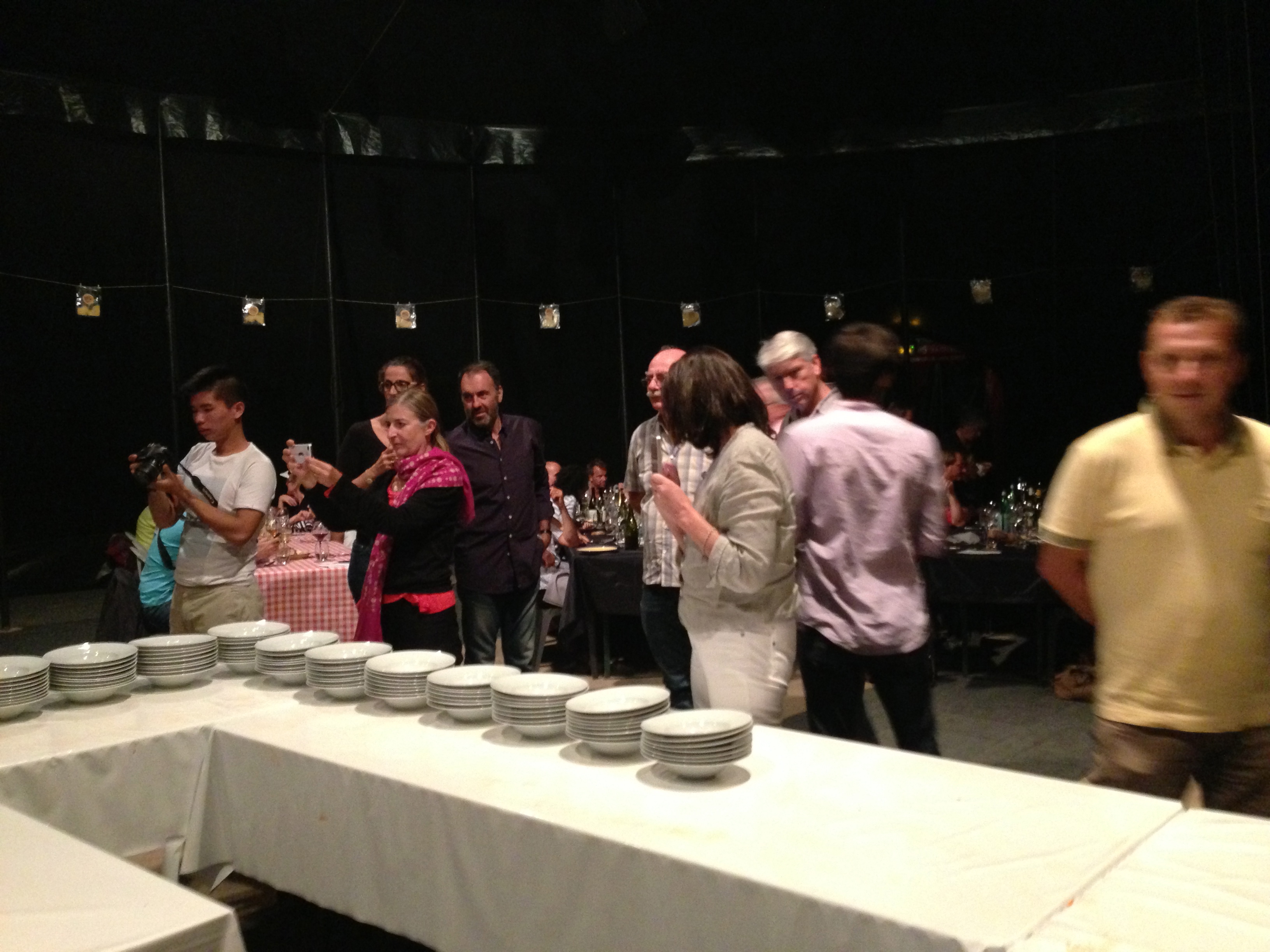 Toujours sous chapiteau, Fulgurances, organisateur d’événements culinaires, propose «Polenta, dîner pour 200 convives» avec le chef Massimo Botura, 3 étoiles au guide Michelin. Ici, le plateau est réduit à des tables blanches en U entourées du public, comme dans un banquet. La mise en scène consiste à dresser les plats avec un fond musical pioché probablement dans une playlist sur le net. Le chef, assisté d’un directeur artistique (sic), raconte quelques anecdotes sur la polenta (comme si cela équivalait à de la fiction) et décore les plats sous le crépitement des photographes amateurs confondant manifestement «Cuisines en Friche» avec l’émission «Top chef». Ici, la cuisine fait le show et l’art culinaire se goute dans l’assiette (succulentes bribes de Polenta en dessert). Soit. Mais il y a d’excellents restaurants pour cela ou des foires aux vins si vous aimez les histoires…Finalement, cette “performance” mérite-t-elle tant d’honneurs? Plutôt que de confier ce type de rendez-vous à une agence événementielle, la Friche serait bien inspirée d’inclure les artistes pour accompagner les grands chefs cuisiniers à accommoder leurs œuvres avec ceux des arts de la scène…