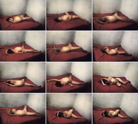 Puis, à la manière du père de Conte d’amour, nous prenons l’escalier pour descendre dans la pièce centrale. Chambre mortifère ? Crypte ? Cette pièce unique, entièrement recouverte sur les quatre côtés de photographies d’Antoine d’Agata, impressionne d’emblée : nous voilà pris au piège. Mais moins celui de la manipulation que de la beauté convulsive. Les corps sont là, ouverts au sexe, à la drogue ou à la guerre. Les visages sont crus, et quand ils nous regardent, ils le font froidement. L’univers tremble dans cet espace clos. Les images aussi : photographie, peinture, cri, tout est flux qui se recompose en se décomposant. Tout est poreux. La médiation de l’appareil photo est elle-même atteinte par cette perforation : tout s’expose au-dehors. L’artiste en premier, qui met sa peau sur la table, littéralement. Son corps est une présence exacerbée, morcelée, sacrifiée. Ses photographies sont au présent, car on pressent que la mort rôde et qu’elle le renifle ; l’enfermement de cette salle n’est qu’une protection illusoire.
