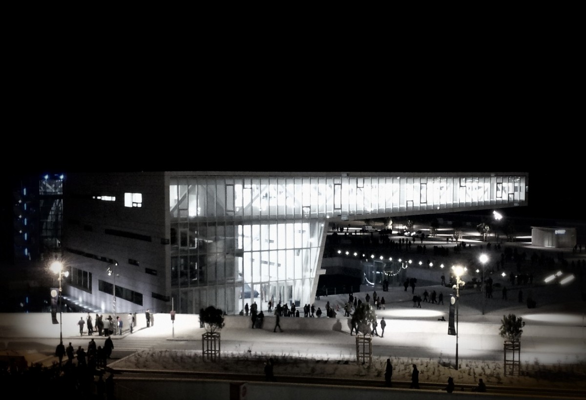 Nous longeons la côte, comme si c’était la première fois, fascinés comme des enfants par ces bâtiments éclairés (La cathédrale de la Major, la Villa Méditerranée, le musée des Civilisations de l’Europe et de la Méditerranée –Mucem-,…). Les grues nous tirent, le paquebot nous embarque, les nouvelles constructions nous invitent et l’espace piétonnier  nous englobe tous dans une même dynamique : un vivre ensemble joyeux.