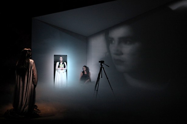Lui n’impose rien à priori. Point de rituel à l’entrée du gymnase Aubanel. Juste, un filet qui sépare la scène et la salle et où sont projetées différentes séquences vidéos. Fabrice Murgia, metteur en scène Belge, est enfin adoubé par le In après avoir fait ses classes dans le OFF. « Notre peur de n’être » est librement inspiré d’un texte de Michel Serres, « Petite Poucette », manifeste joyeux et lucide sur la nouvelle génération née avec internet et baignée dans l’univers interactif des smarphones. Ici, la visée dynamique de Michel Serres est plongée dans la vision apeurée et dépressive de Fabrice Murgia qui dessine à gros traits le portrait d’un homme endeuillé, d’un fils cloitré dans l’univers du Net, d’une jeune femme en recherche de reconnaissance de ses compétences créatives dans les nouvelles technologies. Je suis rapidement saturé par un flot d’images au service d’un spectacle sans vision, autocentré sur des personnages qui, sous la caméra de Murgia, peinent à savoir où ils vont sur une scène de théâtre. Ici, la scénographie prend le pouvoir au service d’une esthétique téléguidée pour la télévision. Ainsi va le théâtre dirigé par un metteur en scène trouillard (la lettre lue à l’issue de la représentation est à ce titre éloquente.)…