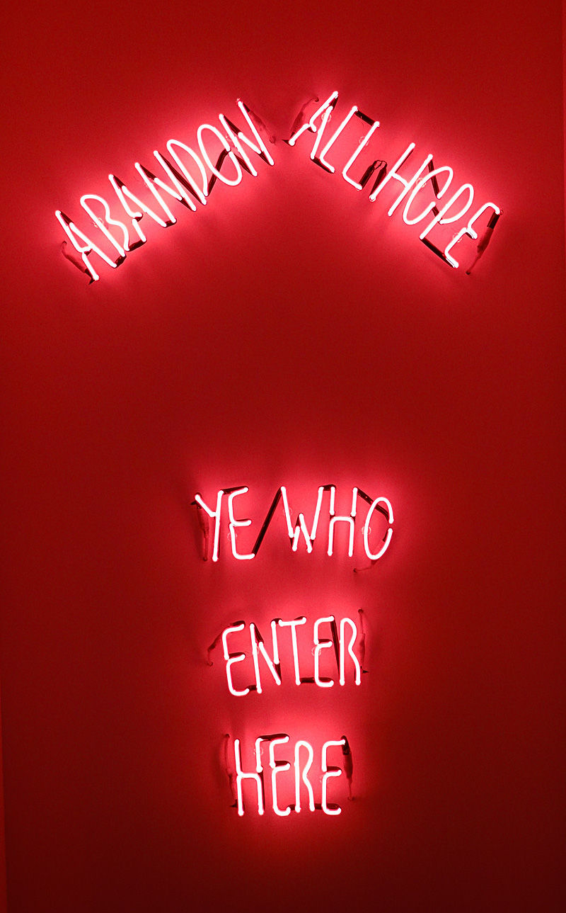 Quelques semaines plus tard, je retourne en Avignon pour consacrer une journée à cette exposition. Et ce ne fut pas de trop pour les quelques deux cents œuvres présentées provenant aussi bien de la Collection Lambert que de la prestigieuse collection privée d’Enea Righi (à laquelle s’ajoutent d’autres grandes collections). C’est une expérience assez glaçante que de franchir les portes et les murs d’une prison, d’y longer ses immenses couloirs et de pénétrer dans des cellules exiguës où l’on croise encore les fantômes des prisonniers à travers leurs graffitis et leurs photographies laissées sur les murs. L’enfermement carcéral est perceptible aussi à travers les œuvres choisies: on est accueilli dans les couloirs de la prison par le néon clignotant de Ross Sinclair qui annonce la couleur « Abandonnez tout espoir, vous qui entrez ici » et par les sculptures en résine de Xavier Veilhan représentant cinq policiers à taille humaine et au visage livide montant la garde. Le parcours de l’exposition nous amène ensuite à passer d’une cellule à une autre pour découvrir les foisonnantes propositions artistiques et pour accomplir un chemin de croix douloureux avec ses moments de compassion et d’espérance.