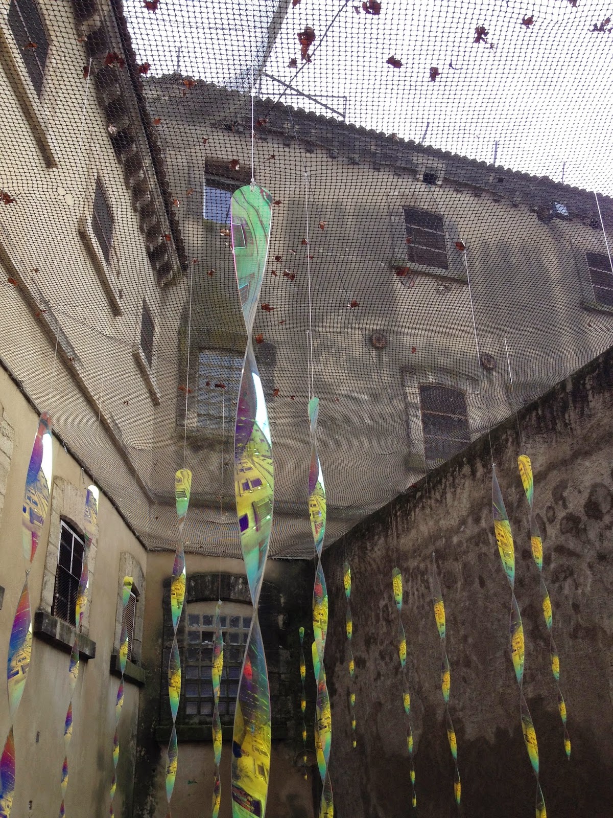 Pourtant l’installation de Claude Lévêque représentant une ligne serpentine de néons rouges évoluant dans un brouillard diffus ne vient-elle pas tracer une évasion mentale dans ce long couloir sombre où elle se trouve placée ? À moins que son titre avec toute son ironie « J’ai rêvé d’un autre monde » ne suggère que l’œuvre est bien à sa place dans le couloir de cette prison et qu’elle véhicule une tout autre expérience qu’au dernier étage de l’Hôtel de Caumont où elle se trouvait jusqu’à présent confinée. Quoi qu’il en soit les lucioles de l’espoir parviennent à scintiller, plus particulièrement dans la cour des Isolés de la prison à travers les lamelles en plexiglas torsadées de l’artiste polonais Miroslaw Balka suspendues à un grillage qui s’agitent au gré du vent et reflètent à travers des gouttes de lumière notre visage à l’infini qui peut lui-même tourner, s’envoler, s’élever dans les airs pour rejoindre les « Hurleurs » du rocher des Doms (situé au dessus de la prison d’Avignon) photographiés par Mathieu Pernot qui flottent eux aussi dans la ville.